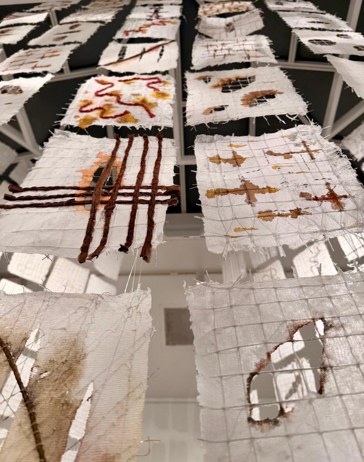La obra nace de un proceso radicalmente íntimo. La artista fabrica cada hoja con fibras naturales —algodón, lino y cáscara de naranja— y, tras el secado, las dibuja una a una, inscribiendo en su superficie una memoria táctil. Trescientas sesenta y tres hojas emergen así como unidades de respiración, fragmentos de tiempo que luego son unidos mediante suturas visibles, tensiones y nudos delicados que configuran una arquitectura sensible suspendida en el espacio.